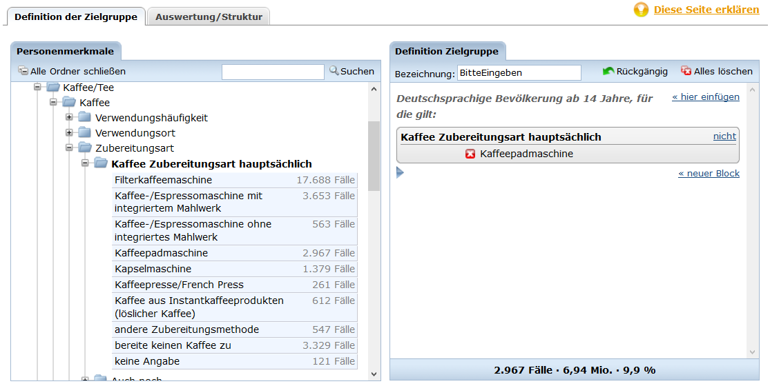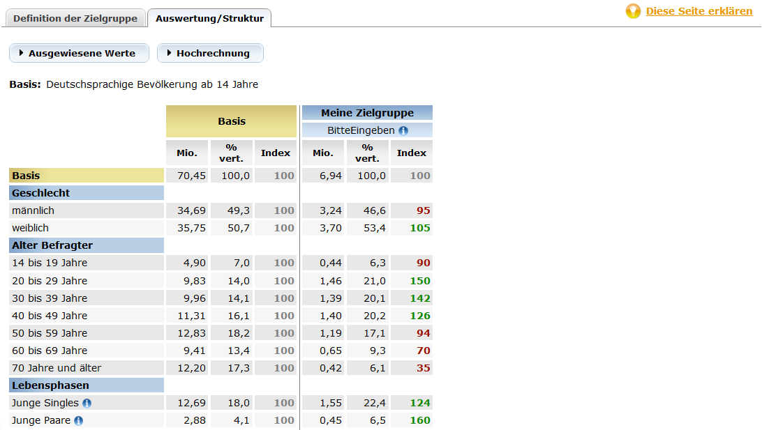 In diesem Bereich haben Sie die Möglichkeit, basierend auf der strukturellen Beschreibung und der Ausweisung des Zielgruppenanteils an der deutschsprachigen Bevölkerung über 14 Jahre, interaktiv die für Sie optimale Zielgruppe zu bestimmen.